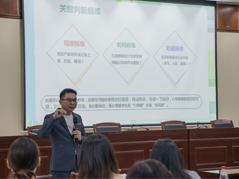 培训明确区分发展性问题与心理障碍,以时间、程度、功能三大标准科学判断,聚焦情绪剧烈变化、行为异常突变、生理与认知异样三大高危信号,运用 “红绿灯” 预警机制,实现早发现、早预警、早干预,当好学生心灵的 “守门人”。